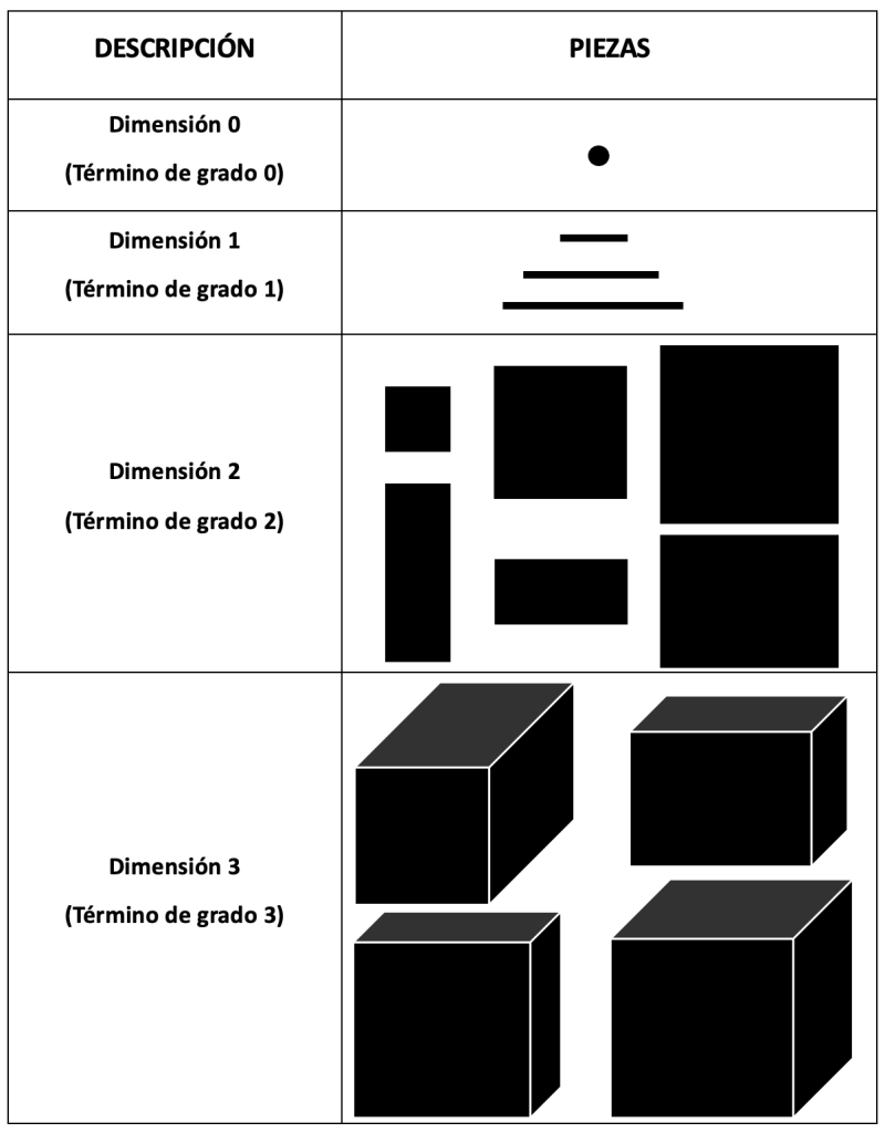 Para trabajar en esta etapa de abstracción se usa material concreto conformado por piezas geométricas. Algunas de estas piezas se pueden ver en la siguiente tabla: